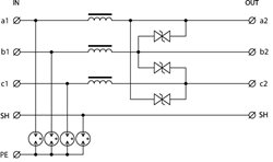 Dvoustupňová přepěťová ochrana třížilových signálových linek, instalace těsně před chráněné zařízení, 24 V DC, max. 370 mA, vazební impedance (L - indukčnost), k ochraně rozhraní řídicích systémů MaR, EZS, EPS apod., zejména rozhraní RS 485, před pulsním přepětím, proti podélnému přepětí (žíla–ochranná zem) hrubá přepěťová ochrana, proti příčnému přepětí (žíla – žíla) hrubá i jemná přepěťová ochrana.
