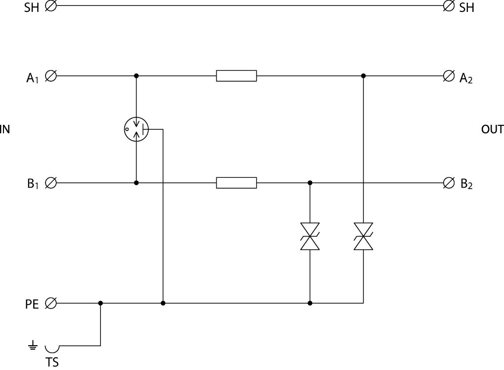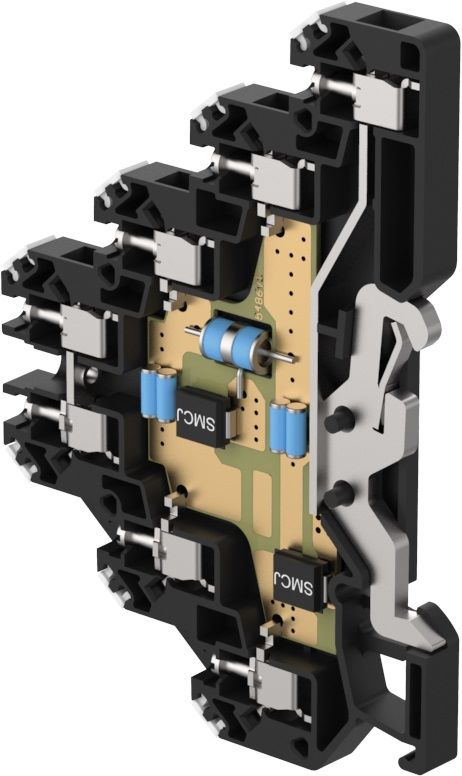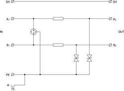 Dvoustupňová přepěťová ochrana dvou jednožilových signálových linek, instalace těsně před chráněné zařízení, 24 V DC, max. 0,5 A, vazební impedance – odpor, šroubové svorky, k ochraně rozhraní řídicích systémů MaR, EZS, EPS apod., zejména ovládacích obvodů, před pulsním přepětím, proti podélnému přepětí (žíla–ochranná zem) hrubá i jemná přepěťová ochrana.