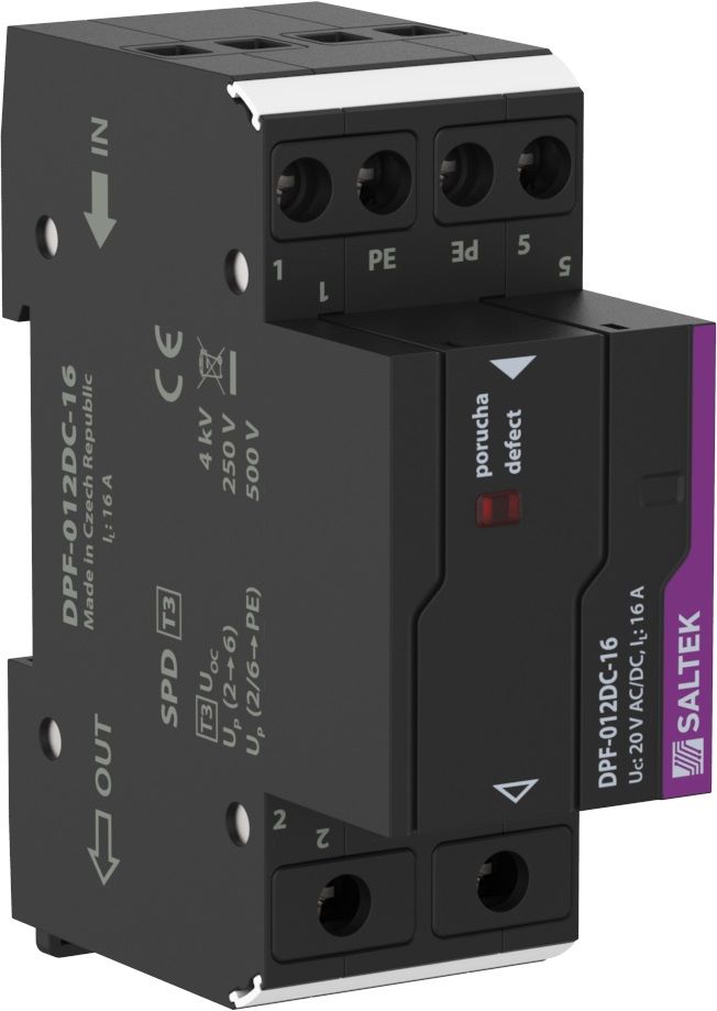 Přepěťová ochrana napájení s integrovaným odrušovacím vf filtrem, do 12 V AC i DC, optická signalizace poruchy, instalace do rozvodů malého napětí v blízkosti chráněného zařízení, k ochraně napájení řídicích systémů MaR, EZS, EPS apod. proti pulsnímu přepětí a vf rušení, pro střídavé i stejnosměrné napájení.