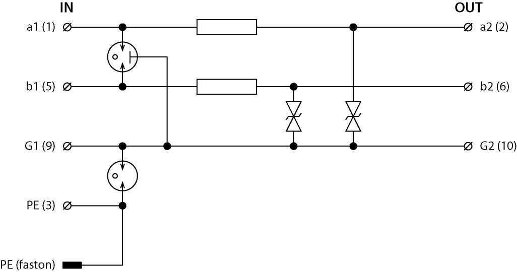 Svodič bleskových proudů s hrubou a jemnou přepěťovou ochranou 2 jednožilových signálových linek, instalace na vstupu do budovy i těsně před chráněné zařízení, 12 V DC, max. 2 A, signálová zem oddělena od ochranné země, vyjímatelný modul, vazební impedance (R – odpor), linka od ochranné země oddělena pomocí bleskojistky, k ochraně rozhraní řídicích systémů MaR, EZS, EPS apod., zejména rozhraní RS 485, před pulsním přepětím, proti podélnému přepětí (žíla–ochranná zem) hrubá i jemná přepěťová ochrana.