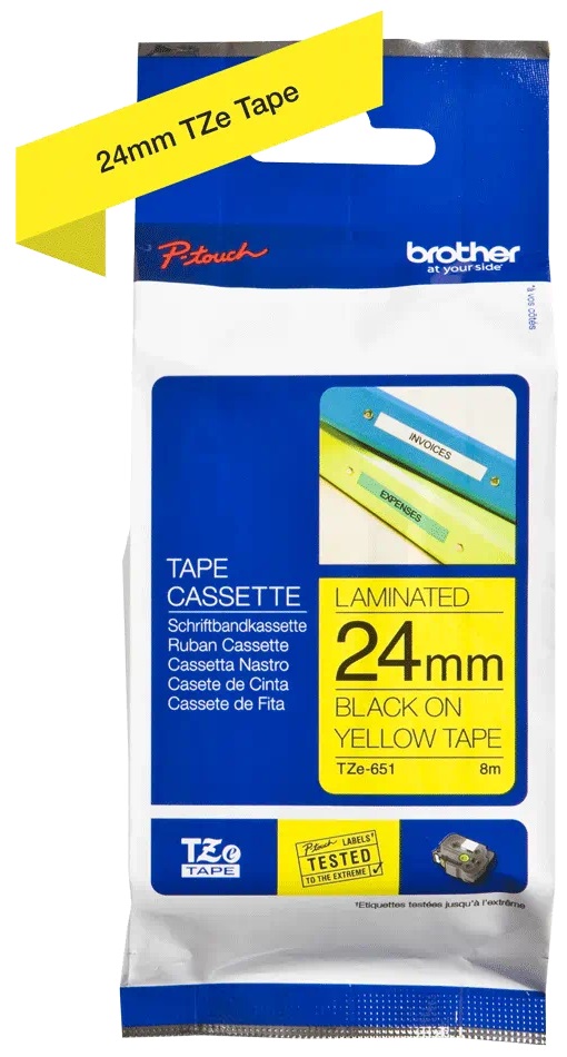 Kazeta TZe-651 s laminovanou páskou s černým tiskem na žlutém podkladu je stejně praktická v domácnosti, kanceláři či pracovišti. Může být použita k identifikaci obsahu šanonů, regálů až po USB flash disky, značení kabeláže a dalších zařízení. Samolepicí laminované štítky z této kazety byly vyvinuty s důrazem na odolnost proti extrémním teplotám, chemikáliím, oděru, slunečnímu záření a působení vody tak, aby byly vhodné pro vnitřní i venkovní použití.