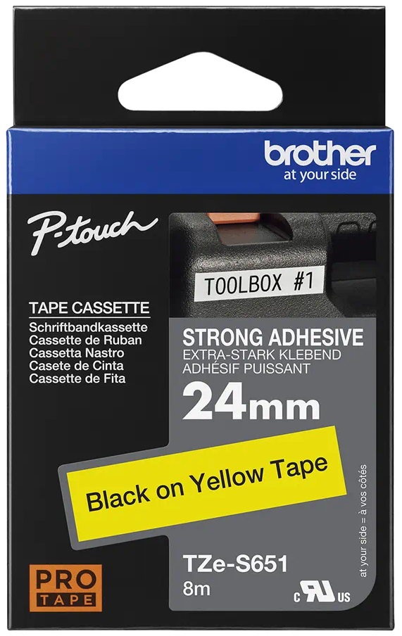 Páska Brother TZe-S651 s černým tiskem na žlutém podkladu a extra silným lepidlem je ideální pro značení na hrubých a nerovných površích, jako jsou kovové skříňky nebo texturované plasty. Díky laminované vrstvě odolává vodě, chemikáliím, oděru, UV záření i extrémním teplotám. Měkčí složení lepidla zajišťuje lepší přilnavost a dlouhou životnost štítků i v náročných podmínkách.