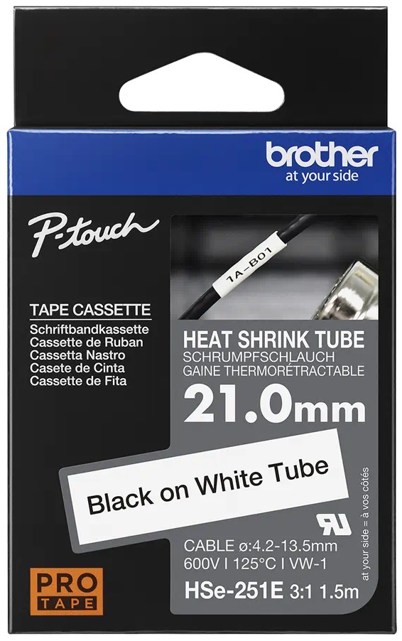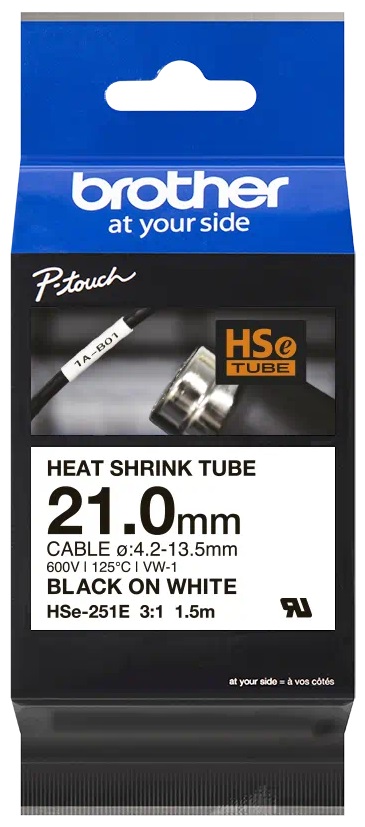 Originální tepelně smršťovací trubička Brother HSe-251E o šířce 21 mm je určena speciálně pro trvalé značení a identifikaci kabelů a vodičů. Při smršťovacím poměru 3:1 se doporučuje použití HSe-211E s černým tiskem na bílém podkladu pro kabely o průměru od 4,2 mm do 13,5 mm. Kompatibilní s tiskárnami štítků P-touch, které mají logo HS nebo HSe na krytu kazety s páskou.