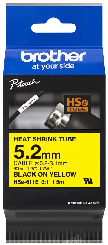 Originální tepelně smršťovací trubička Brother HSe-611E o šířce 5,2 mm je určena speciálně pro trvalé značení a identifikaci kabelů a vodičů. Při smršťovacím poměru 3:1 se doporučuje použití HSe-611E s černým tiskem na žlutém podkladu pro kabely o průměru od 0,8 mm do 3,1 mm. Kompatibilní s tiskárnami štítků P-touch, které mají logo HS nebo HSe na krytu kazety s páskou.