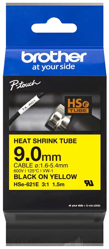 Originální tepelně smršťovací trubička Brother HSe-621E o šířce 9 mm je určena speciálně pro trvalé značení a identifikaci kabelů a vodičů. Při smršťovacím poměru 3:1 se doporučuje použití HSe-621E s černým tiskem na žlutém podkladu pro kabely o průměru od 1,6 mm do 5,4 mm. Kompatibilní s tiskárnami štítků P-touch, které mají logo HS nebo HSe na krytu kazety s páskou.