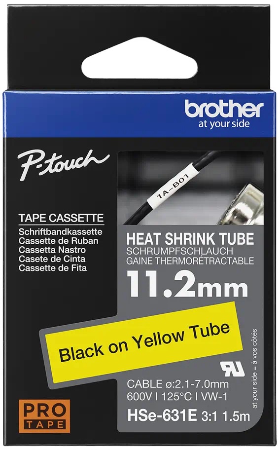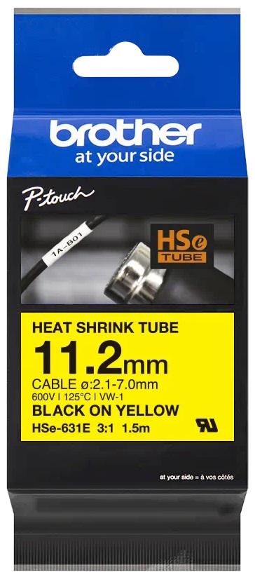 Originální tepelně smršťovací trubička Brother HSe-631E o šířce 11,2 mm je určena speciálně pro trvalé značení a identifikaci kabelů a vodičů. Při smršťovacím poměru 3:1 se doporučuje použití HSe-631E s černým tiskem na žlutém podkladu pro kabely o průměru od 2,1 mm do 7 mm. Kompatibilní s tiskárnami štítků P-touch, které mají logo HS nebo HSe na krytu kazety s páskou.