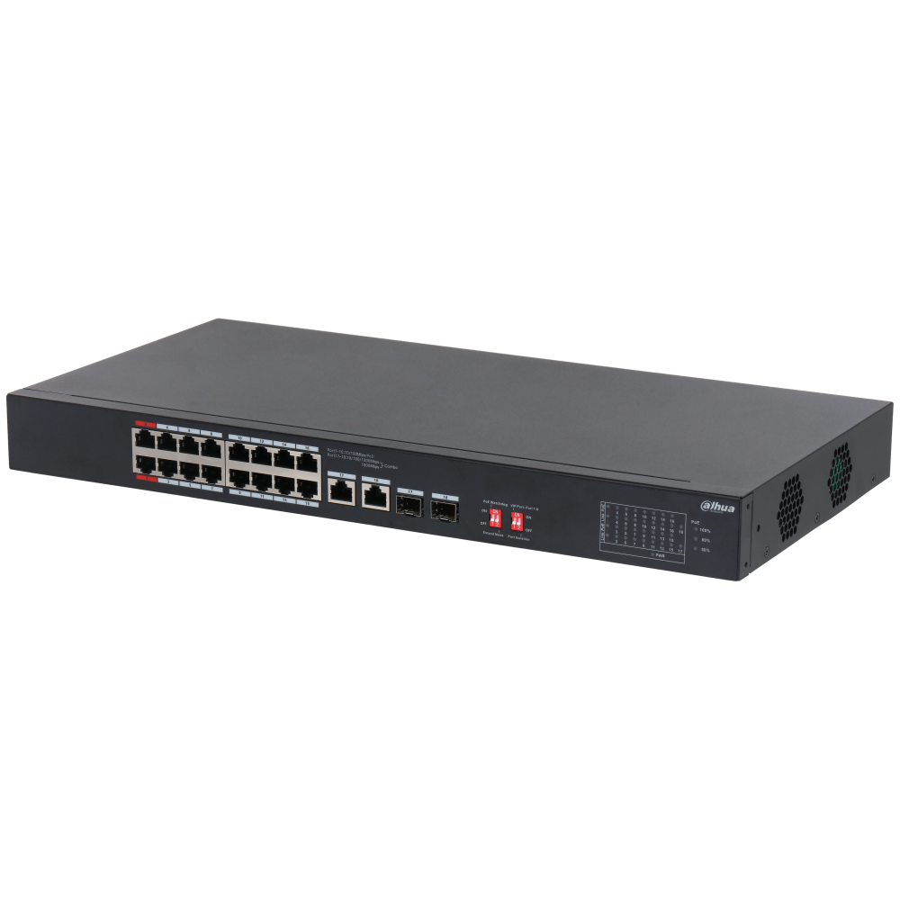 Popis portů: 16 x PoE 10/100 Mbps, 2 x uplink 10/100/1000 Mbps (combo), 2 x SFP 1000 Mbps (combo)