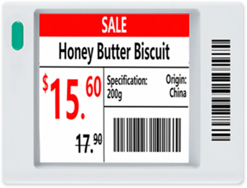 Elektronický digitální papír ESL velikost 1.54" pro maloobchodní regálové štítky, kombinace barev černá, bílá, červená. Komunikace s obslužným AP pomocí správy na Cloud účtu a SW třetích stran přes API rozhraní. Napájení knoflíkovou baterií CR2450 3V, 600 mAh, životnost 3 roky při přepisu 4x denně, rozměr 44.5 mm × 35.9 mm × 12.1 mm