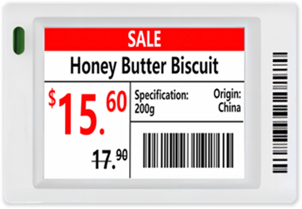 Elektronický digitální papír ESL velikost 1.8" pro maloobchodní regálové štítky, kombinace barev černá, bílá, červená. Komunikace s obslužným AP pomocí správy na Cloud účtu a SW třetích stran přes API rozhraní. Napájení knoflíkovou baterií CR2450 3V, 600 mAh, životnost 3 roky při přepisu 4x denně, rozměr 52.5 mm × 35.9 mm × 10.5 mm
