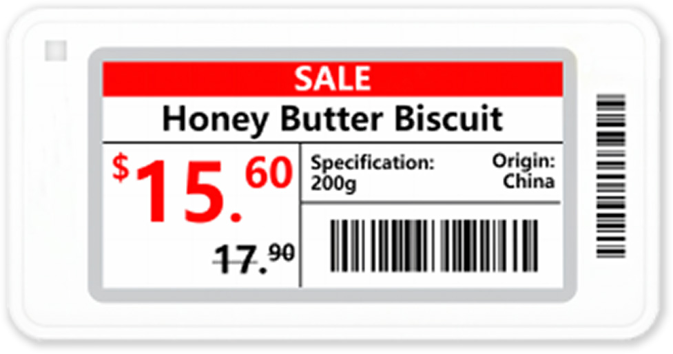 Elektronický digitální papír ESL velikost 2.13" pro maloobchodní regálové štítky, kombinace barev černá, bílá, červená. Komunikace s obslužným AP pomocí správy na Cloud účtu a SW třetích stran přes API rozhraní. Napájení 2x knoflíkovou baterií CR2450 3V, 600 mAh, životnost 5 let při přepisu 4x denně, rozměr 70 mm × 34.5 mm × 11.91 mm