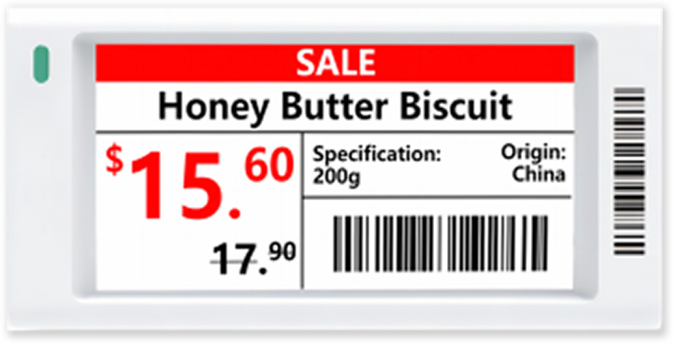 Elektronický digitální papír ESL velikost 2.6" pro maloobchodní regálové štítky, kombinace barev černá, bílá, červená. Komunikace s obslužným AP pomocí správy na Cloud účtu a SW třetích stran přes API rozhraní. Napájení 2x knoflíkovou baterií CR2450 3V, 600 mAh, životnost 5 let při přepisu 4x denně, rozměr 83 mm × 41 mm × 12.1 mm