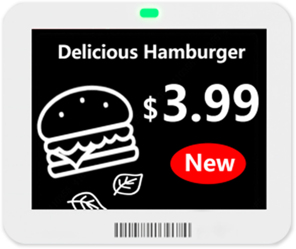Elektronický digitální papír ESL velikost 4.2" pro maloobchodní regálové štítky, kombinace barev černá, bílá, červená, NFC. Komunikace s obslužným AP pomocí správy na Cloud účtu a SW třetích stran přes API rozhraní. Napájení 2x knoflíkovou baterií CR2450 3V, 600 mAh, životnost 5 let při přepisu 4x denně, rozměr 103.6 mm × 87 mm × 10.3 mm
