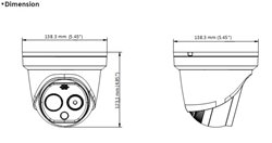 Venkovní DOME IP termo-optická kamera s rozlišením termosnímače 256x120 při 25 sn/s a optickým rozlišením 4MPix při 25 sn/s. Objektiv termosnímače 2,1mm s úhlem záběru 90°, objektiv optického snímače 2,2mm s úhlem záběru 117,8°, teplotní rozsah měření -20-150°, Přesnost ±8°C, LED blikač, audio alarmová hláška. alarm IN/OUT 1/1, audio IN/OUT 1/1, IR přísvit 15m, WDR 120dB, Napájení PoE/12V=, krytí IP66, slot na microSD kartu do 256GB, rozměry: průměr 138,3 x 123,1 mm, hmotnost 0,94 kg, barva bílá.