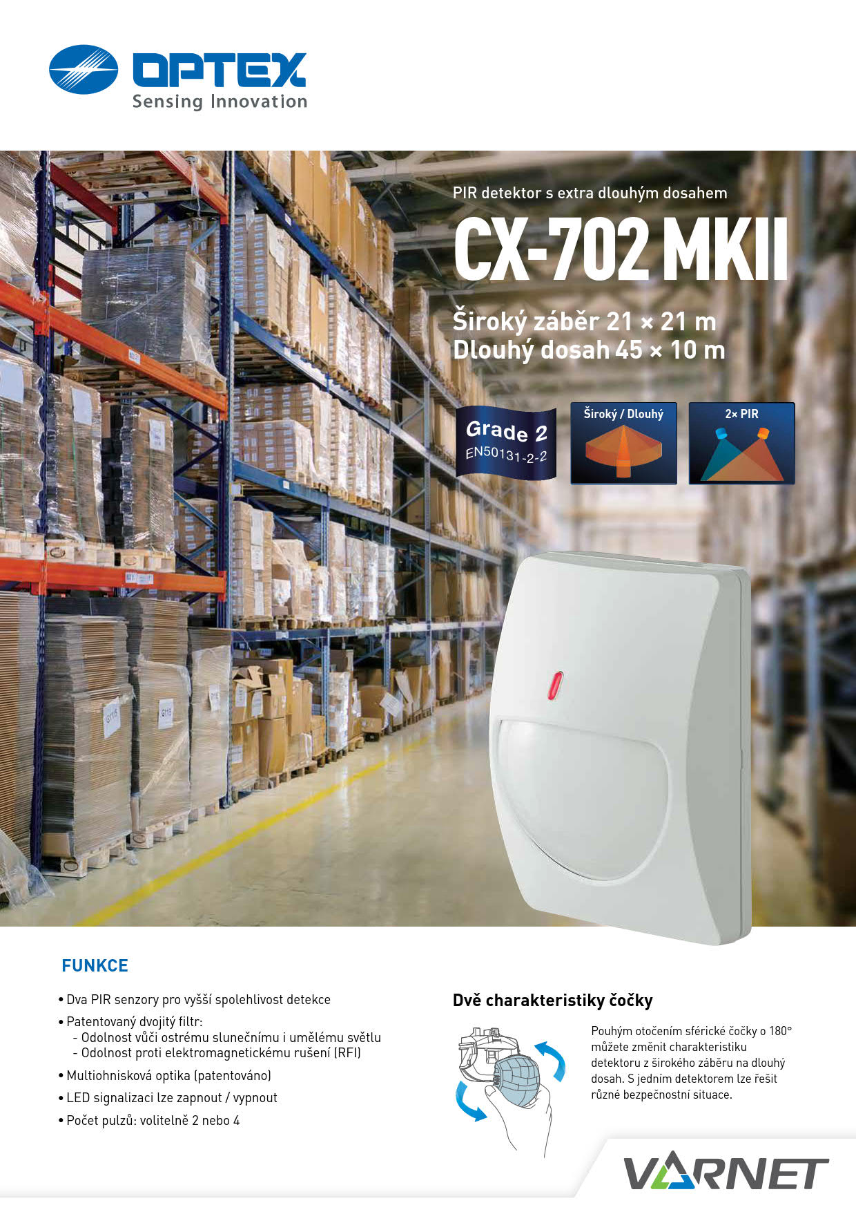 Digitální detektor do vnitřního prostředí s extra dlouhým dosahem. Otočením čočky lze nastavovat charakteristiku na širokou (21 x 21 m) nebo úzkou a dlouhou (45 x 10 m). Detektor používá dva vzájemně sklopené PIR senzory pro zajištění dostatečné citlivosti i v nejvzdálenějších místech detekované plochy. Detektor má velký rozsah instalační výšky od 1,5 do 3,6 m.