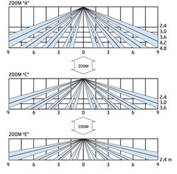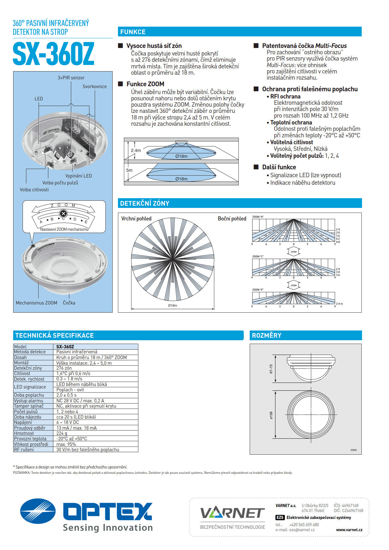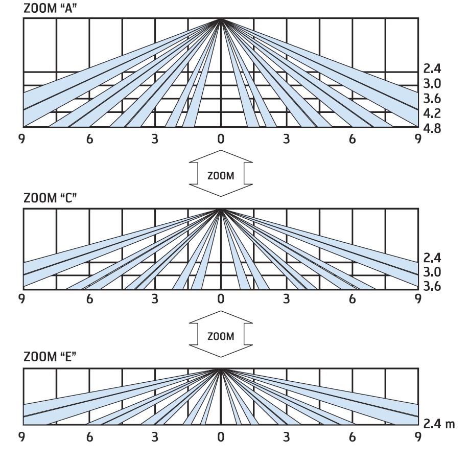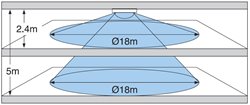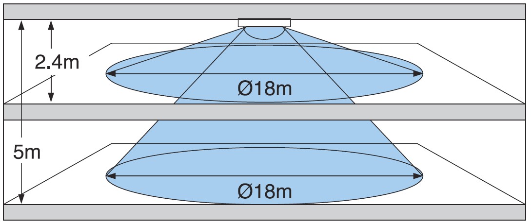 Stropní detektor s instalační výškou 2,4 m až 5 m a s průměrem hlídané plochy 18 m v celém intervalu instalační výšky. Detektor má funkci ZOOM pomocí kterého se pro danou výšku instalace nastaví plný záběr 18 m.
