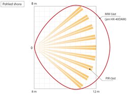 2x PIR detektor s dosahem 12 m 85°. Dvojice PIR senzorů zajišťuje PET imunitu v celé detekční oblasti se zachováním detekce osoby. Detektor je dodáván včetně držáku, který umožňuje horizontální i vertikální naklopení. Pomocí přiložených nalepovacích proužků lze některé detekční zóny vymaskovat nebo vymaskováním zkrátit dosah z 12 na 9 / 5,5 / 4 m. Detektor je určený pro montáže s vyšší instalační výškou 2,5 – 3 m. Detektor je vybaven IR antimaskingem proti zakrytí.
