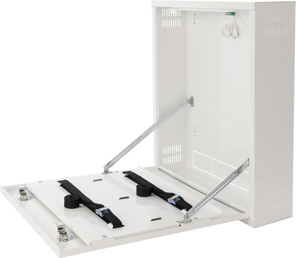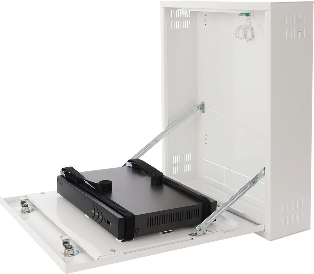 Nástěnný kovový box pro uzamčení záznamového nebo jiného zařízení, univerzální uchycení pro zařízení o rozměrech až š 375 x v 335 x h 95 mm, zabezpečení boxu zámky a tampery, hmotnost 8,2 kg.