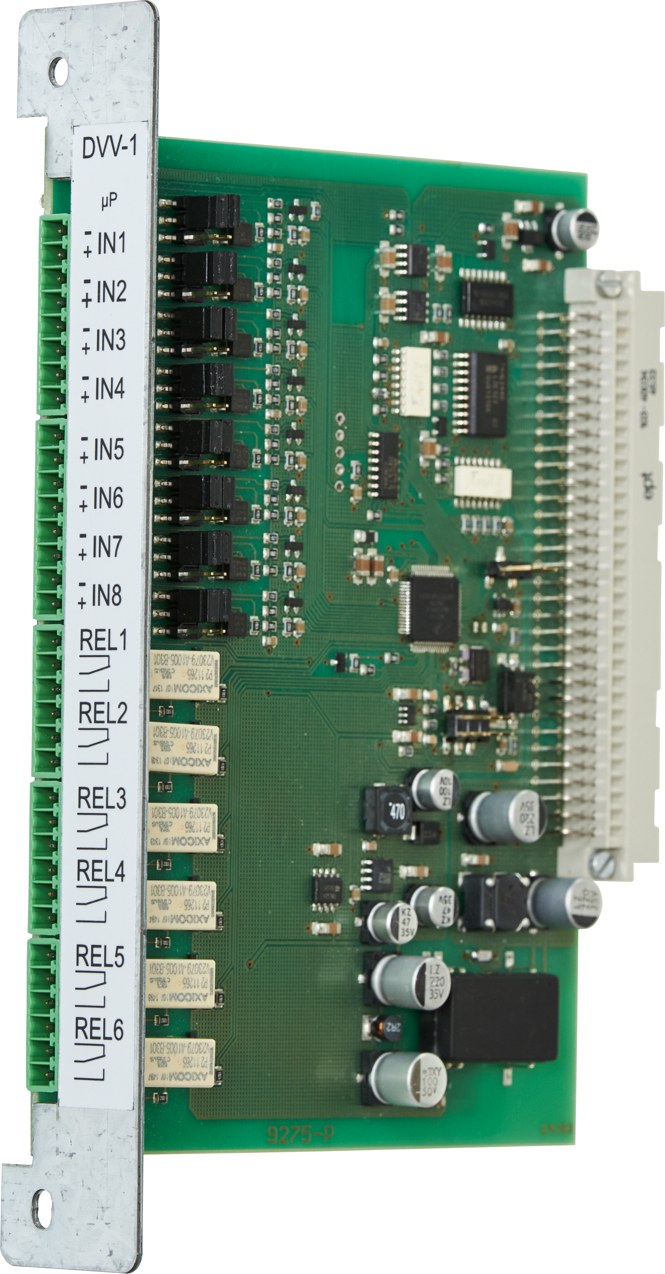 osazuje se do libovolného volného slotu ústředen MHU-116 a MHU-117, LED diody pro optické signalizace stavů V/V a komunikace s DSY, 8 hlídaných kontaktních izolovaných vstupů, 6 releových výstupů s přepínacím kontaktem