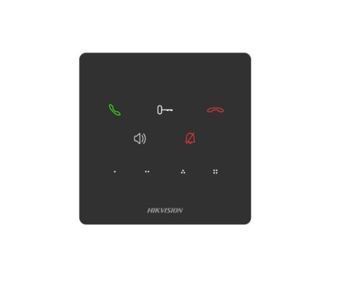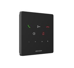 IP audiotelefon s tlačítkovým ovládáním, rozhraní LAN, 4 programovatelná tlačítka, podpora standardního SIP protokolu, NEUMOŽŇUJE volání na mobilní aplikací HIK-CONNECT, vstup pro bytové vyzvánení tlačítko (floor call),vestavěný všesměrový mikrofon, zabudovaný reproduktor, napájení 12V DC/1A (zdroj není součástí dodávky) nebo PoE (IEEE802.3af), rozměry 120 x 120 x 21 mm