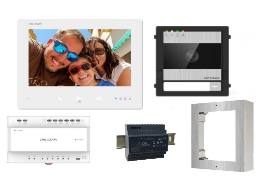 Sada videotelefonu a dveřní stanice v nerezovém provedení. Analog 2-vodič. HD systém. Sada je složena z videotelefonu DS-KH7300EY-WTE2/White, dveřní stanice DS-KD7003EY-IME2, rámečku pro povrchovou montáž DS-KD-ACW1/S, distributoru DS-KAD7060EY a napájecího zdroje (48Vdc). Sada umožňuje sdílení video hovoru s mobilní aplikací HIK-CONNECT pro smartphone/tablet.