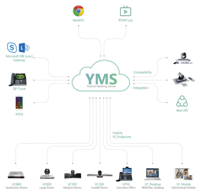 YMS podporuje 4K rozlišení H.265 (HEVC) pro vícecestné video hovory a spolupráci mnoha zařízení včetně velkých systémů, video telefonů, PC softwarů a mobilních aplikací.