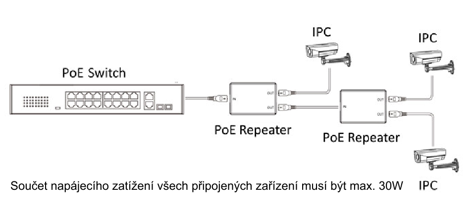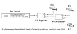 Jednoduchý PoE repeater se dvěma výstupy určený především pro rozbočení vedení LAN s PoE s možností připojení dvou zařízení (napr. IP kamer), napájení dle IEEE 802.3af/at, max. zatížení PoE 30W (v případě použití dvou IP kamer je nutné zkontrolovat jejich příkon, který může být u každé z kamery max 14W), maximální přenosová vzdálenost PoE 100m, jeden vstup a dva výstupy, LED signalizace, plastový kryt, instalace volně, prenosový kapacita 100 Mbps, je možné kaskádovat za sebou maximálně dva repeatery s tím, že celková zatížitelnost všech připojených zařízení musí být maximálně 30W se započnením spotřeby samotného repeateru (1,2W), rozměry: 79 mm × 22 mm × 53 mm.