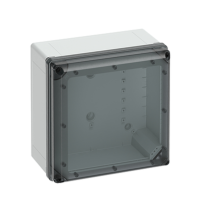 Prázdná skříň, vhodné pro instalaci v zátěžovém prostředí a v nechráněném venkovním prostředí, Krabice: polykarbonát vyztužený skleněnými vlákny, šedá, podobně RAL 7035, Víko: Polykarbonát, s transparentním víkem Rozměry: 300 x 300 x 180 mm