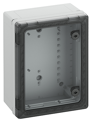 Skříňový rozvaděč, vhodný pro instalaci v zátěžovém prostředí a v nechráněném venkovním prostředí, krabice a rám: polykarbonát vyztužený skleněnými vlákny, šedý, podobný RAL 7035, dvířka: Polykarbonát. rozvaděčové zamykání 3 mm dvojzub (možnost výměny) podle DIN 43668, s transparentními dvířky Rozměry: 300 x 400 x 180 mm