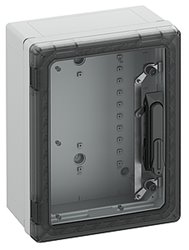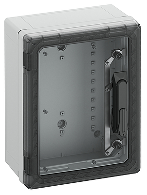 Skříňový rozvaděč, vhodný pro instalaci v zátěžovém prostředí a v nechráněném venkovním prostředí, krabice a rám: polykarbonát vyztužený skleněnými vlákny, šedý, podobný RAL 7035, dvířka: Polykarbonát. půlválcová vložka dle DIN 18252, s transparentními dvířky Rozměry: 300 x 400 x 180 mm