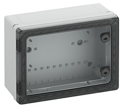 Skříňový rozvaděč, vhodný pro instalaci v zátěžovém prostředí a v nechráněném venkovním prostředí, krabice a rám: polykarbonát vyztužený skleněnými vlákny, šedý, podobný RAL 7035, dvířka: Polykarbonát. rozvaděčové zamykání 3 mm dvojzub (možnost výměny) podle DIN 43668, s transparentními dvířky Rozměry: 400 x 300 x 180 mm
