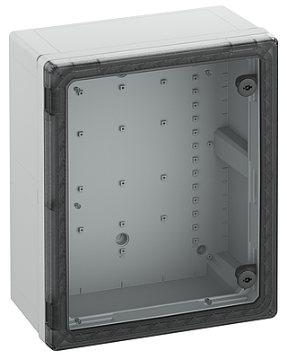 Skříňový rozvaděč, vhodný pro instalaci v zátěžovém prostředí a v nechráněném venkovním prostředí, krabice a rám: polykarbonát vyztužený skleněnými vlákny, šedý, podobný RAL 7035, dvířka: Polykarbonát. rozvaděčové zamykání 3 mm dvojzub (možnost výměny) podle DIN 43668, s transparentními dvířky Rozměry: 400 x 500 x 226 mm