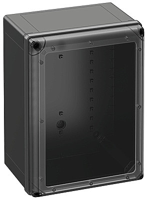 Prázdná skříň, vhodná pro instalaci v zátěžovém prostředí a v nechráněném venkovním prostředí, krabice: polykarbonát vyztužený skleněnými vlákny, černý, podobný RAL 9005, víko: polykarbonát, s transparentními dvířky Rozměry: 300 x 400 x 226 mm