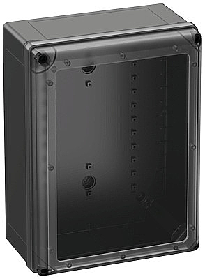 Prázdná skříň, vhodná pro instalaci v zátěžovém prostředí a v nechráněném venkovním prostředí, krabice: polykarbonát vyztužený skleněnými vlákny, černý, podobný RAL 9005, víko: polykarbonát, s transparentním víkem Rozměry: 300 x 400 x 180 mm