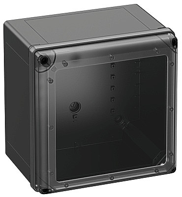 Prázdná skříň, vhodná pro instalaci v zátěžovém prostředí a v nechráněném venkovním prostředí, krabice: polykarbonát vyztužený skleněnými vlákny, černý, podobný RAL 9005, víko: polykarbonát, s transparentními dvířky Rozměry: 300 x 300 x 226 mm