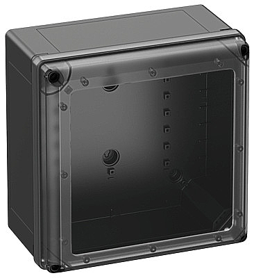 Prázdná skříň, vhodná pro instalaci v zátěžovém prostředí a v nechráněném venkovním prostředí, krabice: polykarbonát vyztužený skleněnými vlákny, černý, podobný RAL 9005, víko: polykarbonát, s průhledným víkem Rozměry: 300 x 300 x 180 mm