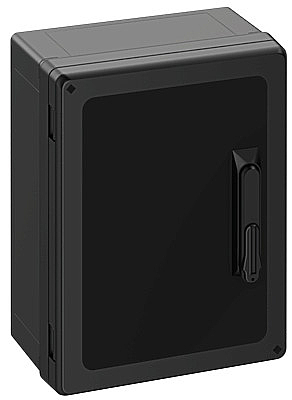 Skříňový rozvaděč, vhodný pro instalaci v zátěžovém prostředí a v nechráněném venkovním prostředí, krabice a rám: polykarbonát vyztužený skleněnými vlákny, černá, podobný RAL 9005, dvířka: Polykarbonát. půlválcová vložka dle DIN 18252, s černými dvířky Rozměry: 300 x 400 x 180 mm