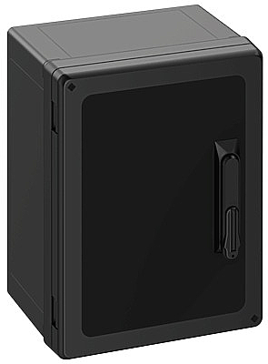 Skříňový rozvaděč, vhodný pro instalaci v zátěžovém prostředí a v nechráněném venkovním prostředí, krabice a rám: polykarbonát vyztužený skleněnými vlákny, černá, podobný RAL 9005, dvířka: Polykarbonát. půlválcová vložka dle DIN 18252, s černými dvířky Rozměry: 300 x 400 x 226 mm