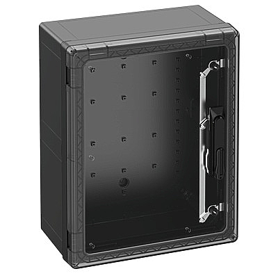 Skříňový rozvaděč, vhodný pro instalaci v zátěžovém prostředí a v nechráněném venkovním prostředí, krabice a rám: polykarbonát vyztužený skleněnými vlákny, černá, podobný RAL 9005, dvířka: Polykarbonát. půlválcová vložka dle DIN 18252, s transparentními dvířky Rozměry: 400 x 500 x 226 mm