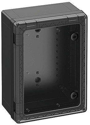 Skříňový rozvaděč, vhodný pro instalaci v zátěžovém prostředí a v nechráněném venkovním prostředí, krabice a rám: polykarbonát vyztužený skleněnými vlákny, černá, podobný RAL 9005, dvířka: Polykarbonát. rozvaděčové zamykání 3 mm dvojzub (možnost výměny) podle DIN 43668, s transparentními dvířky Rozměry: 300 x 400 x 180 mm