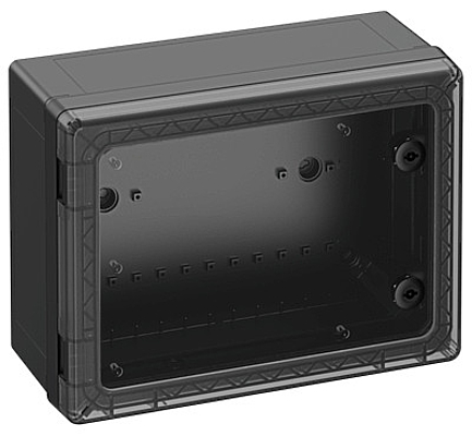 Skříňový rozvaděč, vhodný pro instalaci v zátěžovém prostředí a v nechráněném venkovním prostředí, krabice a rám: polykarbonát vyztužený skleněnými vlákny, černá, podobný RAL 9005, dvířka: Polykarbonát. rozvaděčové zamykání 3 mm dvojzub (možnost výměny) podle DIN 43668, s transparentními dvířky Rozměry: 400 x 300 x 180 mm