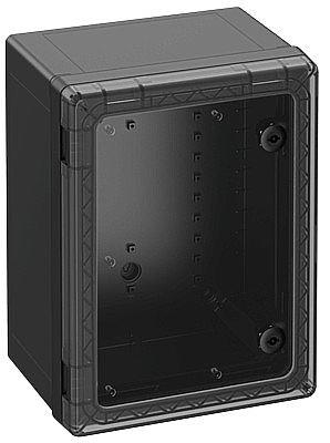 Skříňový rozvaděč, vhodný pro instalaci v zátěžovém prostředí a v nechráněném venkovním prostředí, krabice a rám: polykarbonát vyztužený skleněnými vlákny, černá, podobný RAL 9005, dvířka: Polykarbonát. rozvaděčové zamykání 3 mm dvojzub (možnost výměny) podle DIN 43668, s transparentními dvířky Rozměry: 300 x 400 x 226 mm