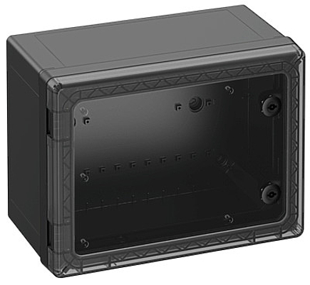 Skříňový rozvaděč, vhodný pro instalaci v zátěžovém prostředí a v nechráněném venkovním prostředí, krabice a rám: polykarbonát vyztužený skleněnými vlákny, černá, podobný RAL 9005, dvířka: Polykarbonát. rozvaděčové zamykání 3 mm dvojzub (možnost výměny) podle DIN 43668, s transparentními dvířky Rozměry: 400 x 300 x 226 mm