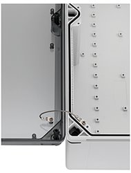Pojistka proti ztrátě víka z ušlechtilé oceli s upevňovacími šrouby, možná dodatečná montáž, K zajištění víka u prázdných skříní GEOS, brání nechtěnému pádu víka, sada = 2 kusy Rozměry: 120 x 170 x 10 mm