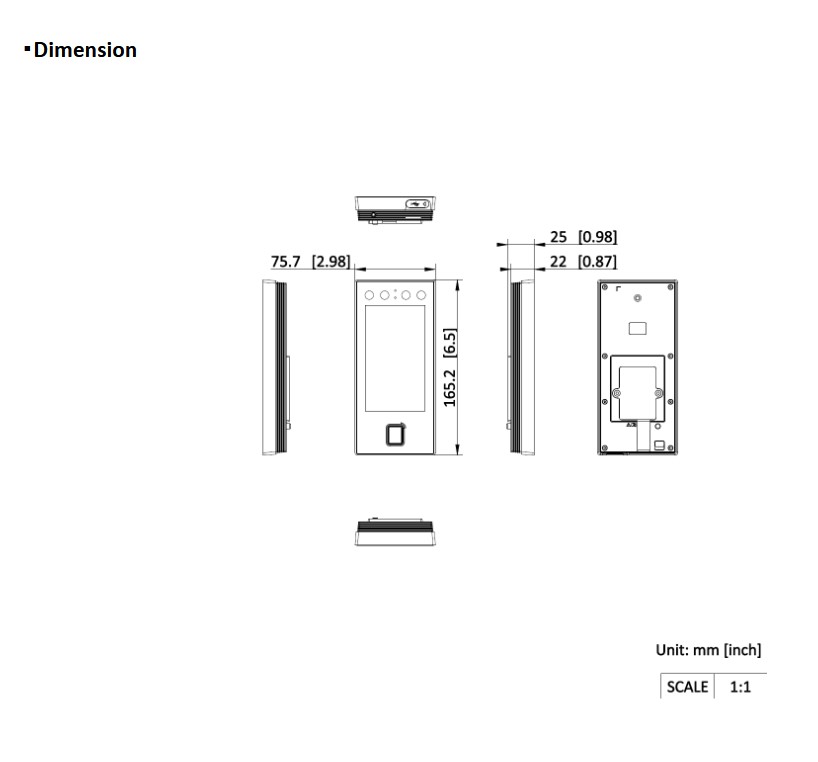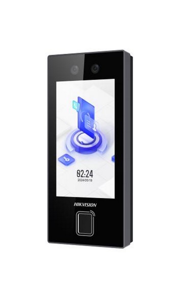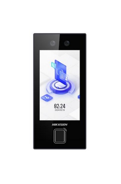 Vstupní terminál s rozpoznáváním obličeje s 4,5" dotykovým displejem a s RFID čtečkou Mifare čipů/karet, četčka otisku prstů, podpora čtení QR kodu, možnost autorizace kodem, WiFi, Bluetooth, podpora rozpoznávání roušek, operační systém: Embedded Linux System, displej: 4,5" dotykový LCD, 480 × 854p, 2Mpx duální kamera, WDR, širokoúhlý objektiv, módy rozpoznávání tváře 1:1 a 1: N < 0.2 s na osobu, míra přesnosti rozpoznání tváře: > 99%, vzdálenost rozpoznání obličeje: 0,3 - 1,5m, doporučená montážní výška 1,4 až 1,9m, počet uložených snímků obličeje: 3000, počet uložených karet: 3000, počet uložených otisků prstů: 3000, paměť na 150 000 událostí, komunikace přes RJ-45 10/100Mbps, 1xRS-485; 1x Wiegand, 1x USB, 1x tamper, 1x lock, 1x odchodové tlačítko, 1x door lock, ALARM IN/OUT - 1/1, venkovní krytí: IP65, montáž na stěnu nebo na stojan, provozní teplota: -30°C až 60°C, napájení: 12 V DC / 1 A nebo PoE, konfigurace přes mobilní telefon/webové rozhraní, podpora Hik-Connect Team režimu, rozměry: 165,2 x 75,7 x 25mm.