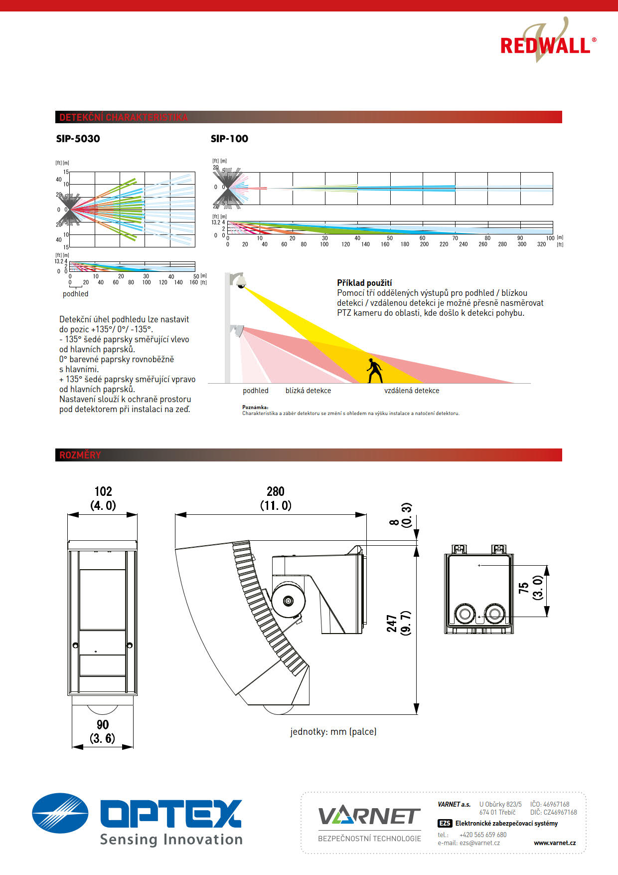 Infrapasivní detektory RedWall slouží pro detekci pohybu na velkou vzdálenost. Detektor je osazený zrcadlovou optikou, třemi PIR senzory, akcelerometrem pro detekci manipulace s detektorem, aktivním IR anitmaskingem pro detekci zastínení, tepelným a světelným senzorem pro korekci citlivoasti. U detektoru lze odděleně nastavit citlivost pro krátkou a pro větší vzdálenost. Spodní podhled s plochou záběru 5 x 5 m zbraňuje podlezení detektoru. Celý detektor je v krytu odolném proti poškození a proti povětrnostním vlivům. Dtektory s dlouhým dosahem RedWall se používají pro spínání záznamu CCTV nebo pro detekci vniknutí na pozemek.