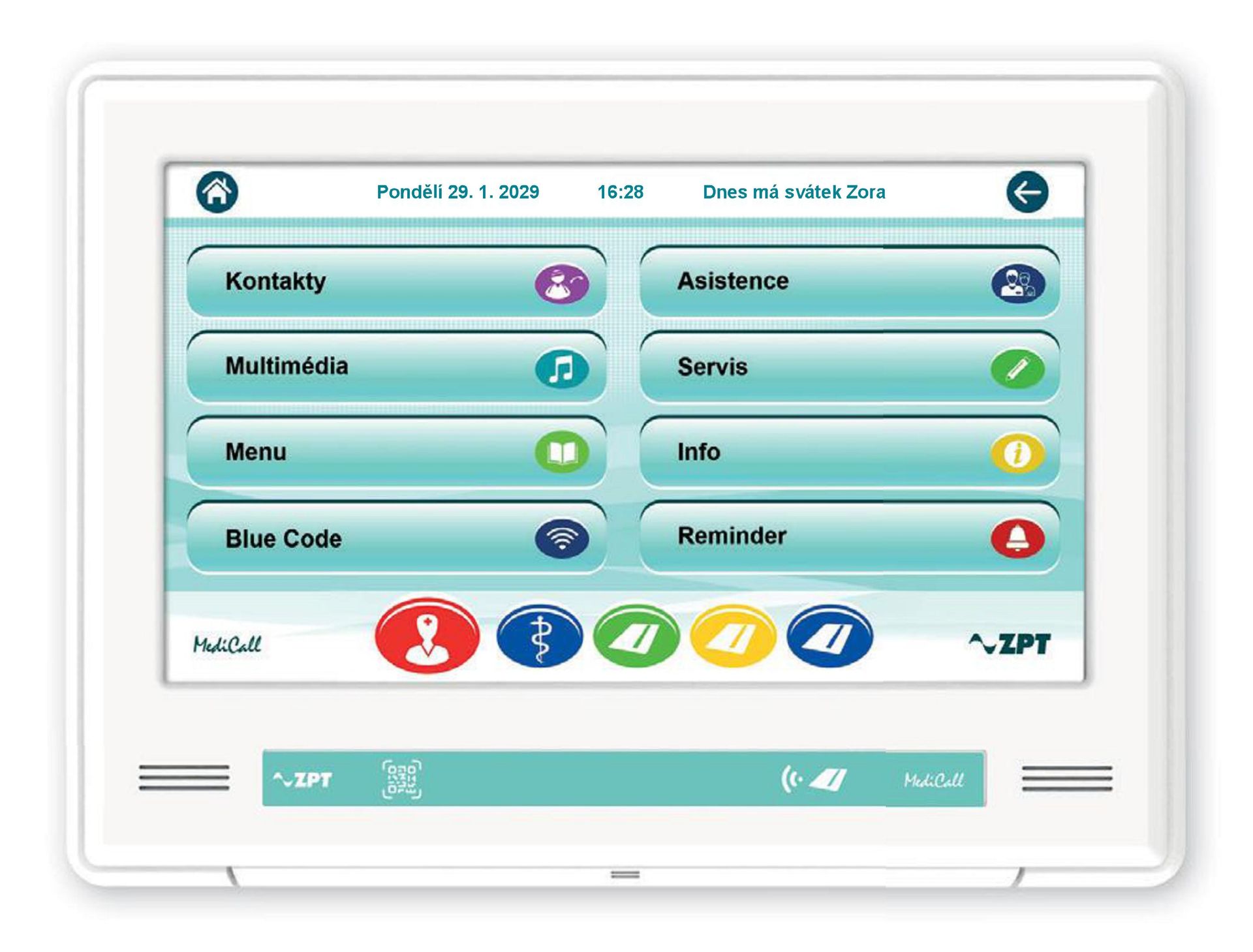 Zařízení s přehledným dotykovým 7“ displejem, které spojuje systém přivolání pomoci se správou zdravotní a ošetřovatelské péče.