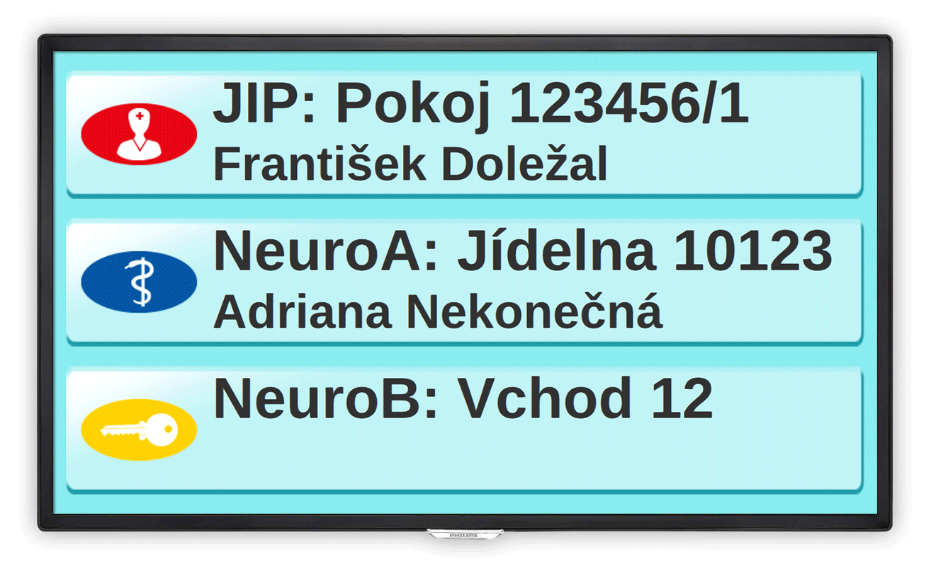 Jedná se o informační 32“ monitor, který se zpravidla umisťuje na chodbu. Jeho prostřednictvím se zobrazují informace o jednotlivých voláních – přesná adresa aktivace místa volání, typ volání, popis volacího místa, jméno volajícího účastníka, lékařský alarm, zobrazování přítomnosti, zobrazování data/času.