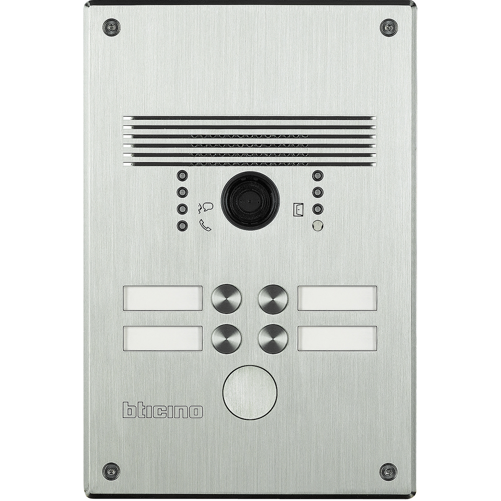 Video vstupní panel LINEA 300 má k dispozici 4x zvonkové tlačítko. Úhel záběru kamery je 124°. Provedení antivandal (nerezová ocel INOX, tloušťka 4mm – IP54, IK 07). Možnost osazení elektronickou čtečkou s centrální administrací