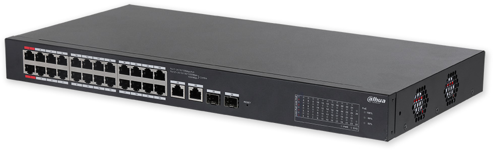 Popis portů: 24 x PoE 10/100 Mbps, 2 x uplink 10/100/1000 Mbps (combo), 2 x SFP 1000 Mbps (combo)