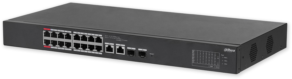 Popis portů: 16 x PoE 10/100 Mbps, 2 x uplink 10/100/1000 Mbps (combo), 2 x SFP 1000 Mbps (combo)